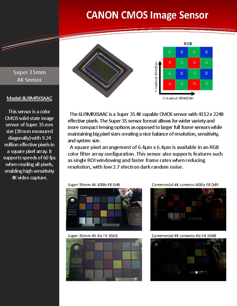 This sensor is a color CMOS solid-state image sensor of Super 35 mm size (30 mm measured diagonally) with 9.24 million effective pixels in a square pixel array. It supports speeds of 60 fps when reading all pixels, enabling high-sensitivity 4K video capture.