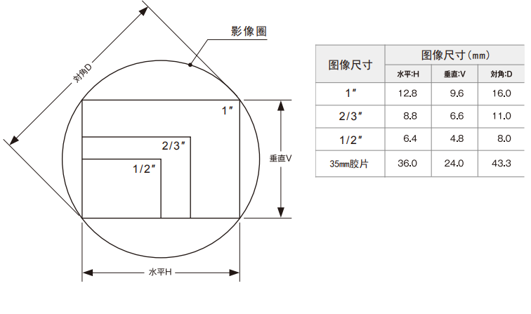 鏡頭成像直徑可覆蓋的最大CCD芯片尺寸。主要有:1/2″、2/3″、1″和1″以上。