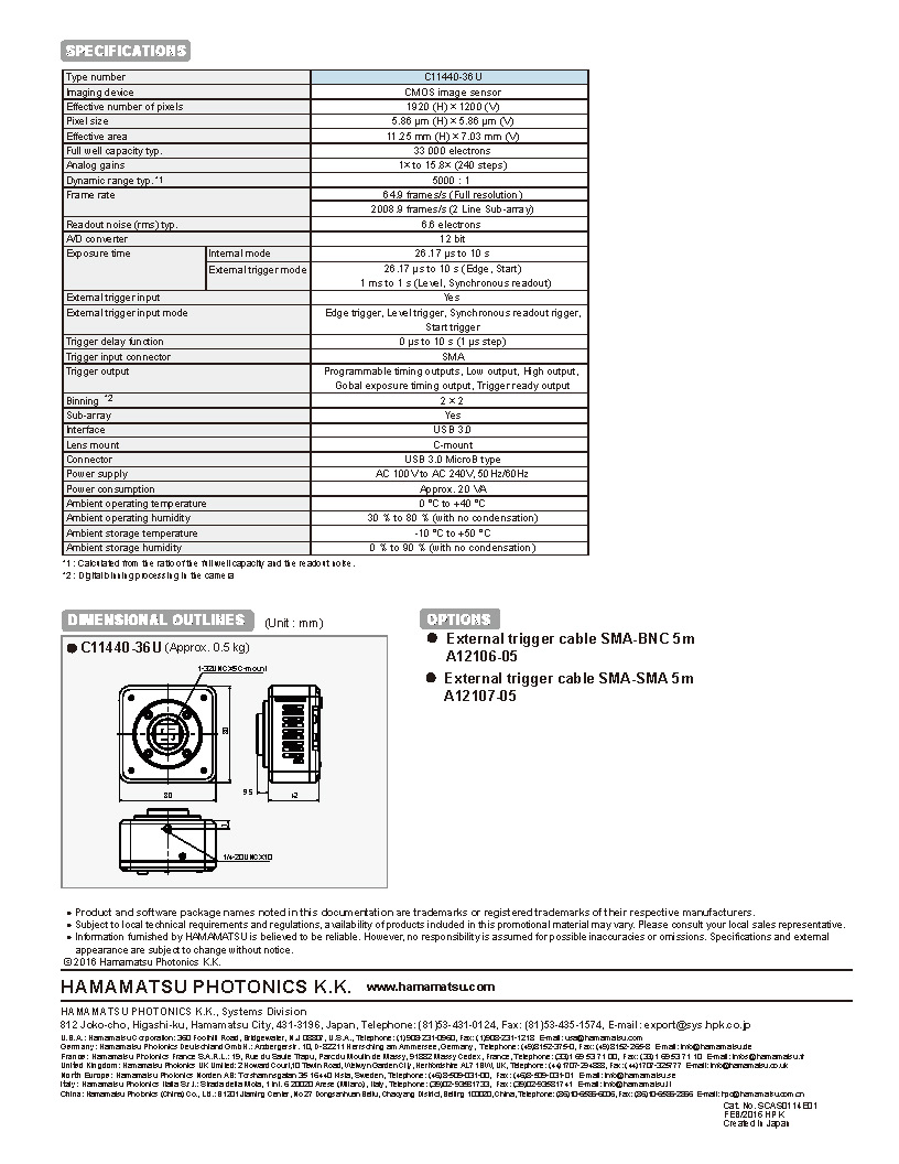 High-speed readout of approx. 65 frames/s Low readout noise of 6.6 electrons Wide dynamic range of 5000 : 1