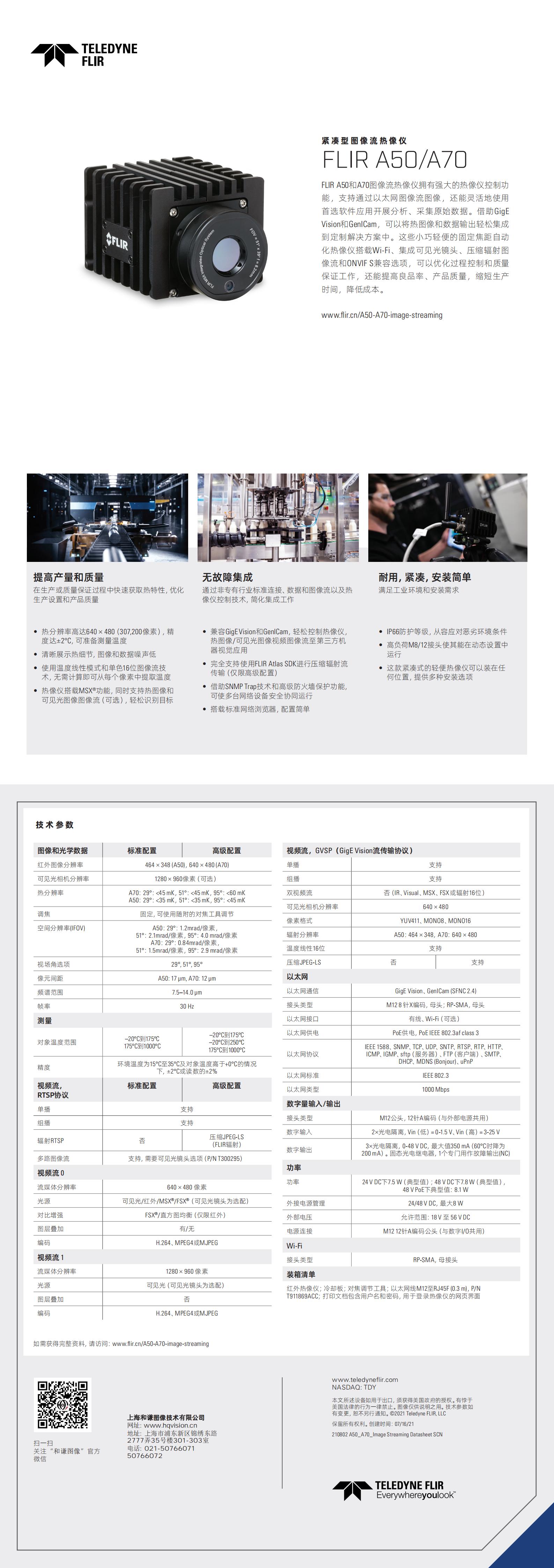 FLIR A50A70熱像流紅外熱像儀是如下用戶的正確選擇:需要基于以太網的熱像儀控制能力和圖像流,還可以使用自己喜歡的軟件應用程序,靈活進行熱特性相關的分析和原始數據收集。這些定焦自動相機小巧輕量,可選配Wi-Fi、集成式可視熱成像儀、壓縮式輻射圖像流以及ONVIF S兼容性(僅限高級版),可優化過程控制和品質保證,從而改善產品的產量、質量、產出時間,并降低成本。