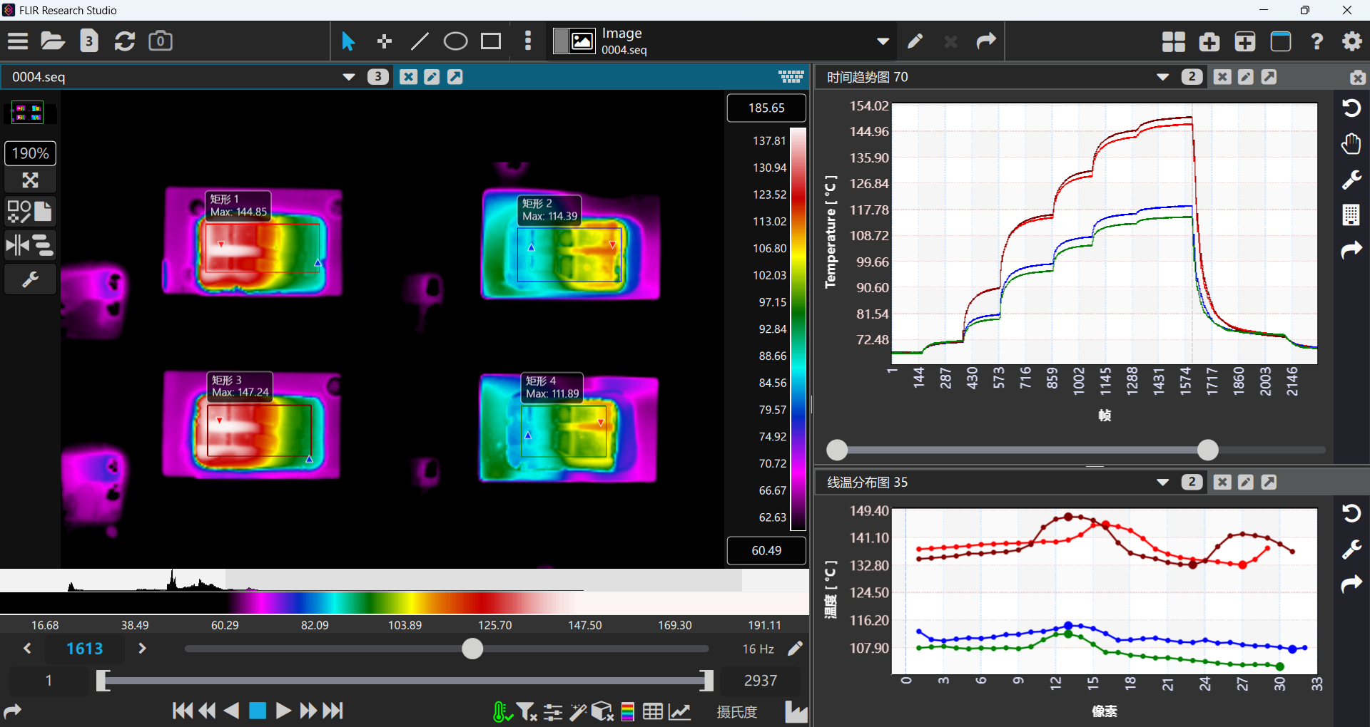 配套的專業分析軟件ResearchStudioPro可以對測試過程進行自定義錄制,回放逐幀分析,生成時域趨勢曲線、線溫分布圖、直方圖和采集幀情況圖表等,支持溫度數值自定義導出,支持滑動相減、自然對數、指數和高斯函數等圖像濾鏡二次算法處理等高級功能。