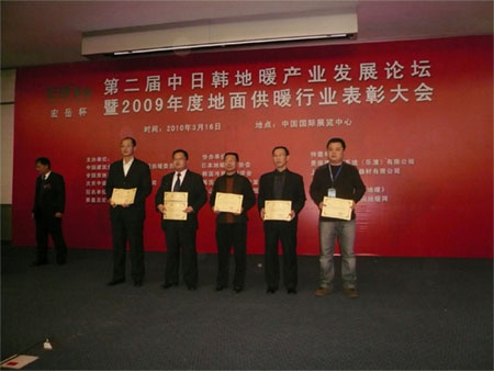 最后,會議進入地面供暖行業年度表彰頒獎儀式環節,秦皇島宏岳塑膠有限公司憑借近年來的穩固發展以及在地暖行業的突出貢獻被評選為“2009年度地暖行業先進集體”,張思良和王明科當選為“2009年度地暖行業先進個人”。本次會議的勝利召開及以上榮譽的獲得,充分證明了宏岳公司在全國地暖行業的優勢地位,同時也為公司的進一步發展打下了堅實的基礎。