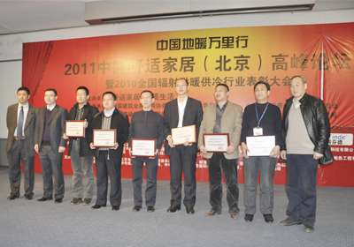 由中國建筑金屬結構協會輻射供暖供冷委員會主辦的“2010年度輻射供暖供冷行業年度評比活動”圓滿結束,并于2011年3月4日在北京舉行頒獎典禮,宏岳管業憑借多年來在地暖行業的突出貢獻及取得的巨大發展成就,被評選為“2010年度全國輻射供暖供冷行業先進集體”,集團公司總經理助理王明科和市場部經理劉漢良由于多年來積極參與地暖行業活動,為推動行業發展及企業建設發揮了重要的作用,被評選為“2010年度輻射供暖供冷行業先進工作者”。同時,秦皇島宏岳建筑安裝有限公司榮獲“2010年度全國輻射供暖供冷行業優秀施工企業”稱號。