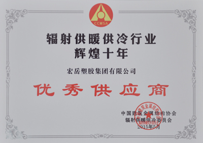 2015年5月15日,中國輻射供暖供冷委員會十周年慶典在北京盛大舉行。會上表彰了一批對輻射供暖供冷行業發展作出突出貢獻的企業和個人,宏岳集團喜獲中國輻射供暖供冷行業輝煌十年優秀供應商殊榮,宏岳塑膠集團有限公司張思良總經理榮獲中國輻射供暖供冷行業功勛獎。