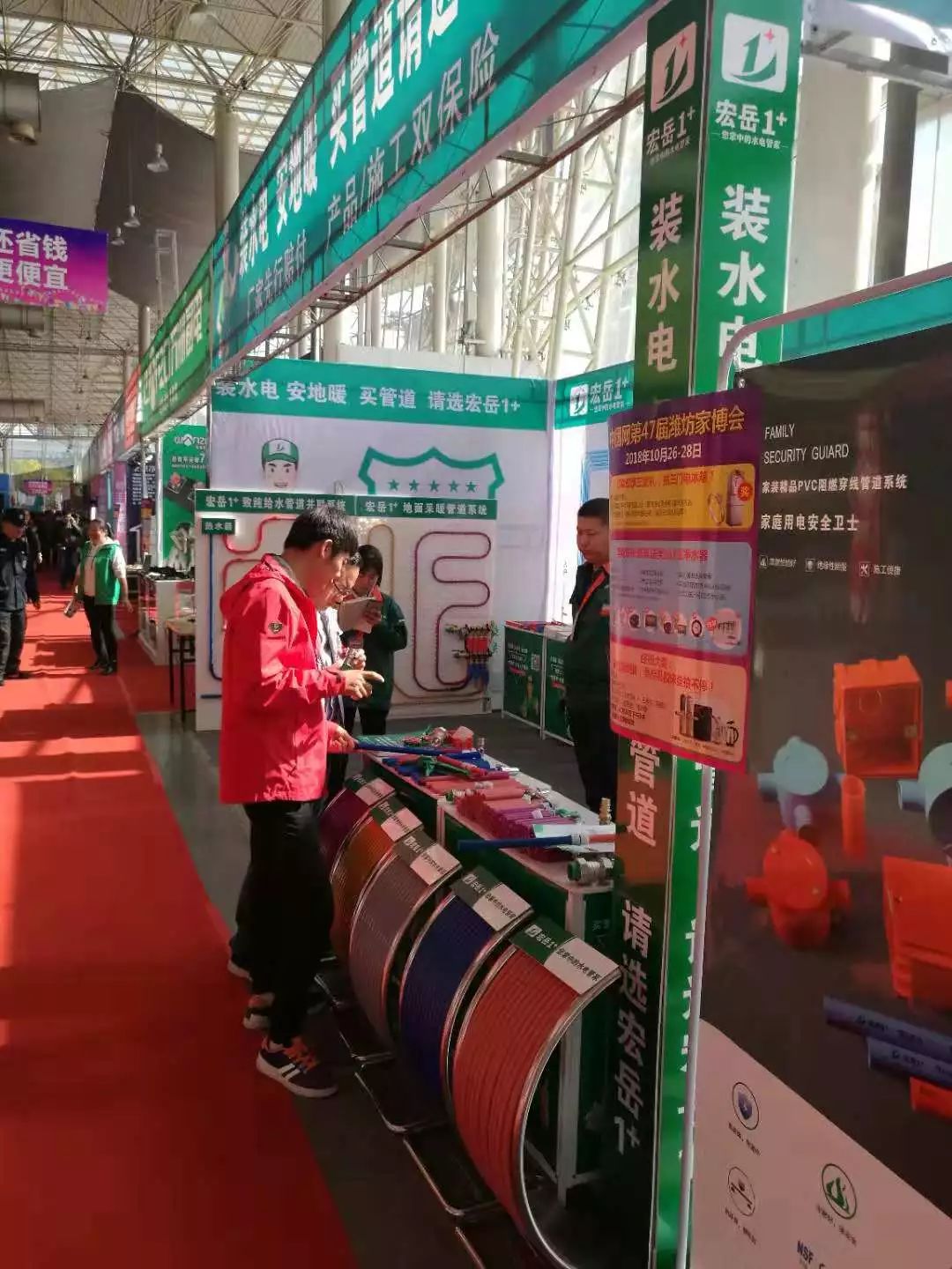2018年10月26日,中團網第47屆家博會在山東濰坊拉開序幕,宏岳1+亮相本次家博會,現場展示了宏岳1+全系列產品,涵蓋了宏岳1+PE-Xa“零”漏點給水系統、家裝精品PPR及PE-RT、PE-Xa地暖管等,吸引了眾多觀展客戶的關注。