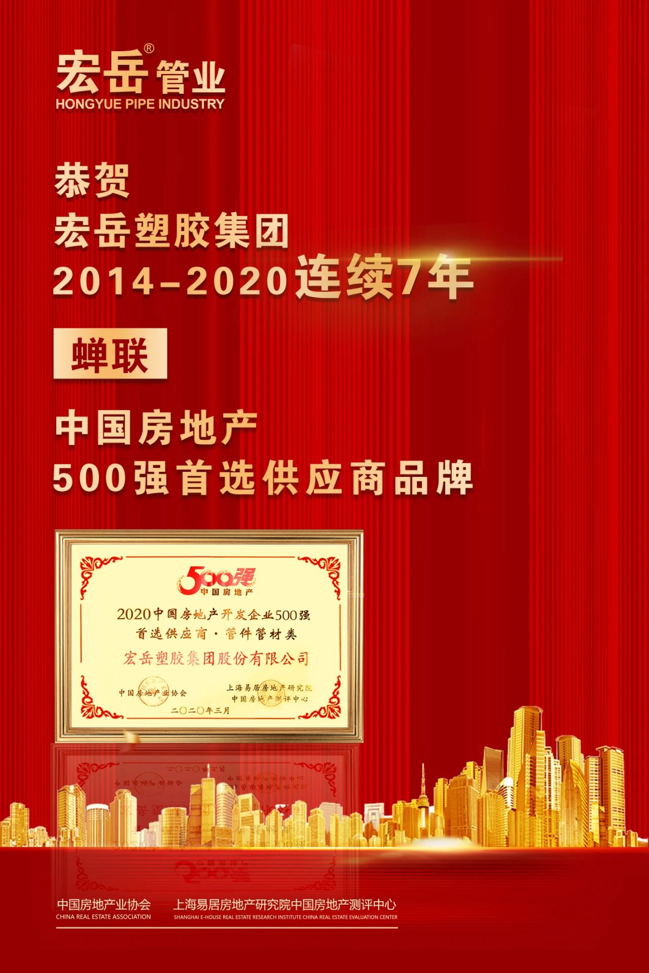 《2020中國房地產開發企業500強測評報告》和《2020中國房地產開發企業500強首選供應商服務商品牌測評報告》同時揭曉。宏岳塑膠集團股份有限公司榮獲2020年中國房地產開發企業500強首選供應商服務商品牌測評榜單的管件管材類5強。